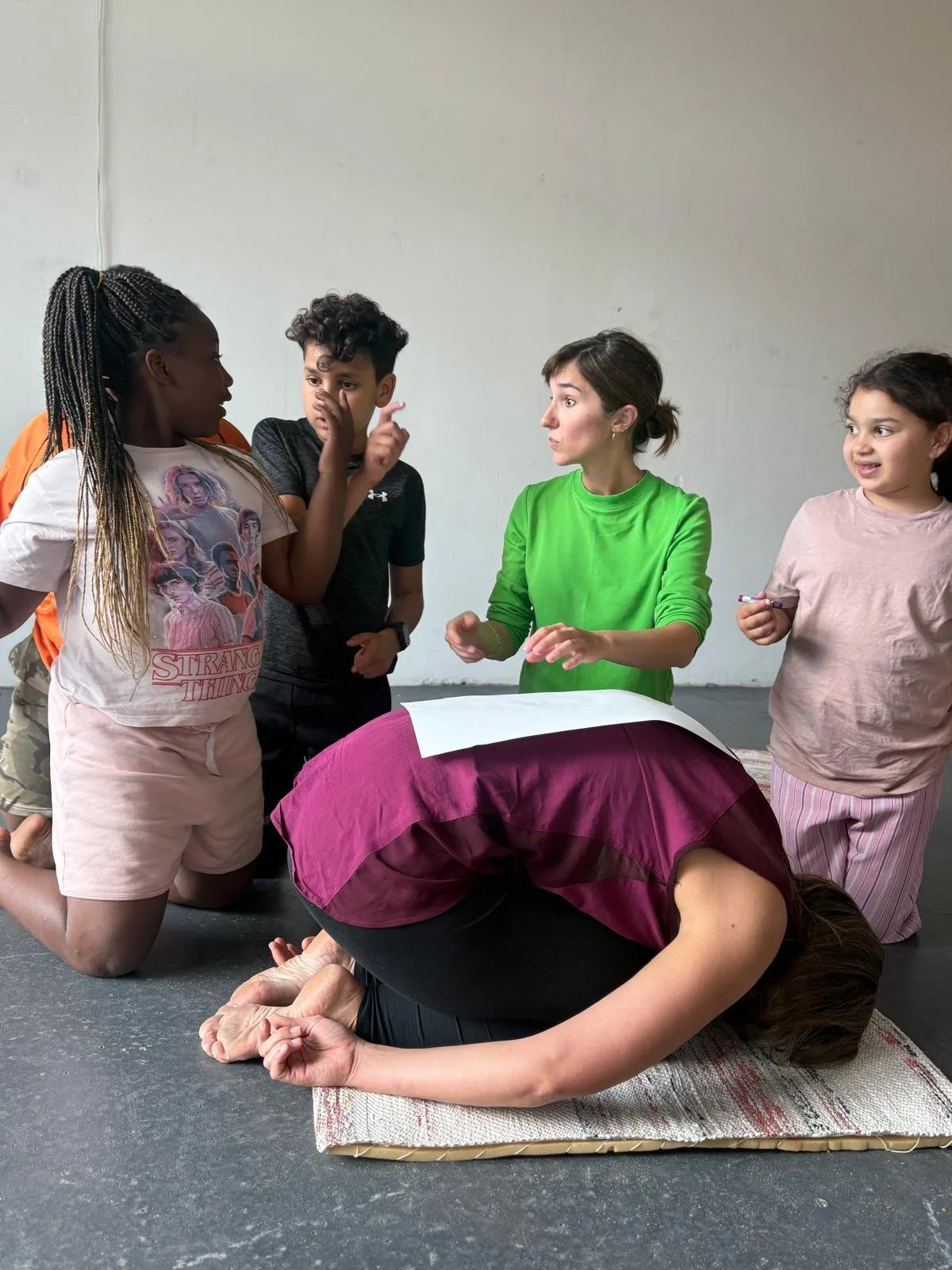 This is an experience, in which children explore co-creating in an embodied way. This ritual involves movement and diverse drawing processes (with closed eyes, with both hands, with feet). Each drawing is a collective work. In this process different parts of the body are used as platforms: the paper is placed on the back, the belly and the head, activating different tactile inputs and impressions.