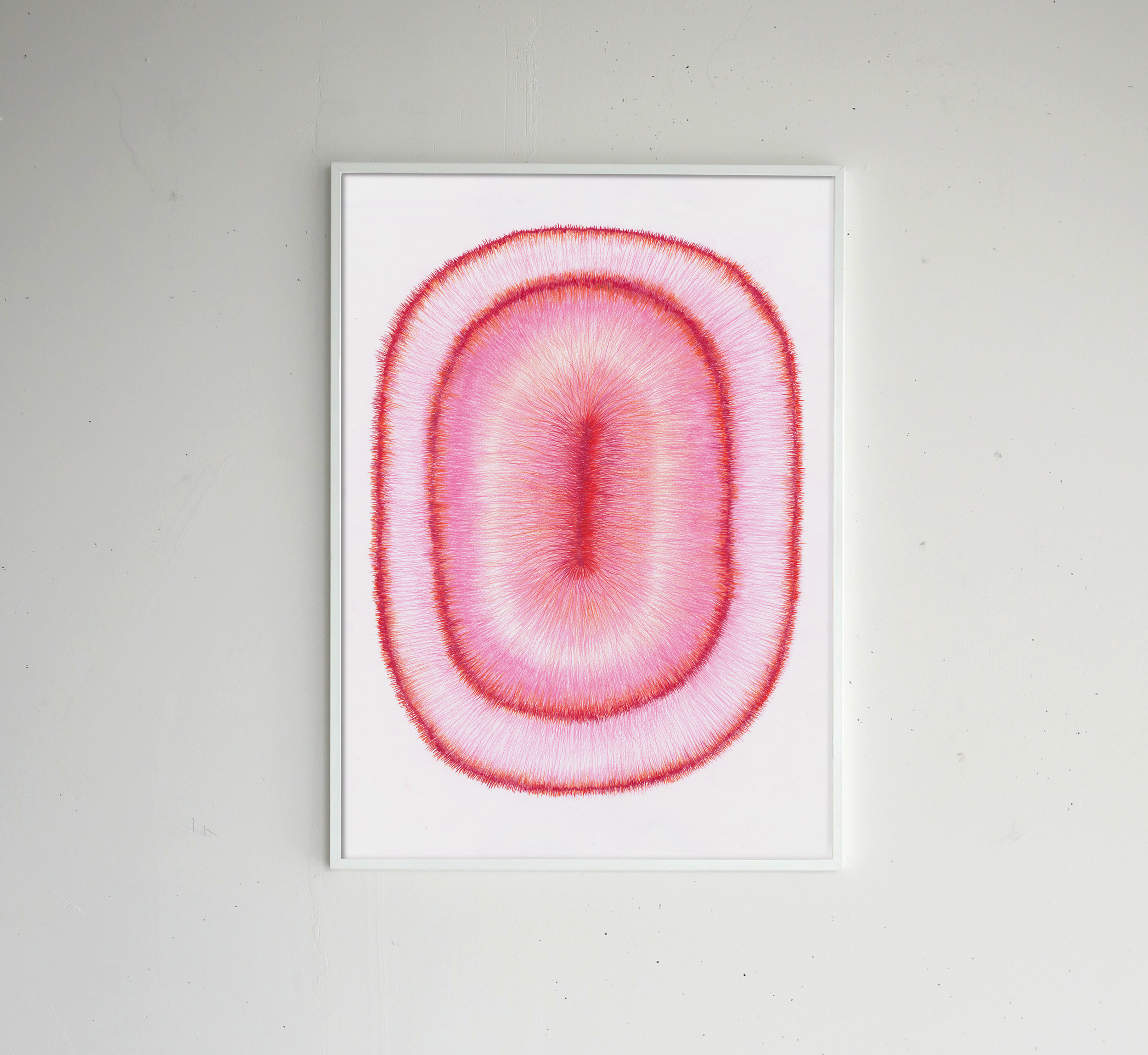 In this installation, people are invited into an intimate environment of daring tranquility. Drawings feature soft lines, furry textures, and elemental forms, resembling mandalas, energetic landscapes, and portraits. Together with the sculptures, of oceanic fluid shapes and colours, they bring the notion of the primal essence of life. The abstract quality of the visual forms of both drawings and sculptures awakens the imagination welcoming new perceptions. In this work we experimented with diverse organic natural fabrics and filling combinations. We found out that the sculptures filled with cherry pits can serve as instruments. Later we used this element in our performance The Ritual of Embrace. Also, we introduced smaller-scale sculptures to be held in the palm of a hand inviting more intimate connection with the work. The Soft Edges was supported by Amsterdams Fonds Voor de Kunst and Urban Resort. It was presented at the Broedplaats Lycka in 2022, the Groene Passage in Rotterdam 2022, at the Stichting La Jetee 2023, and Tour d’Amour in Sloterdijk in 2023.